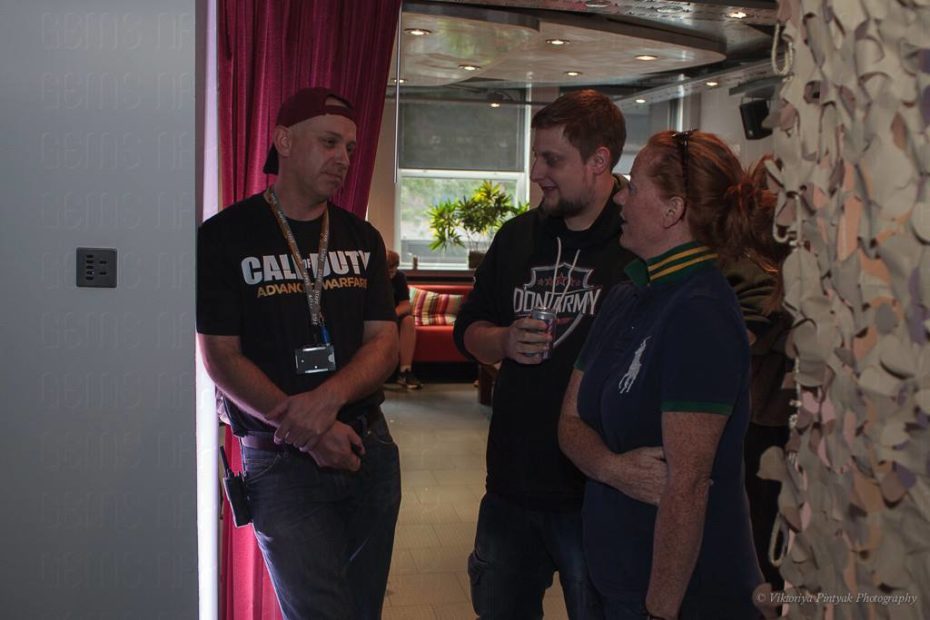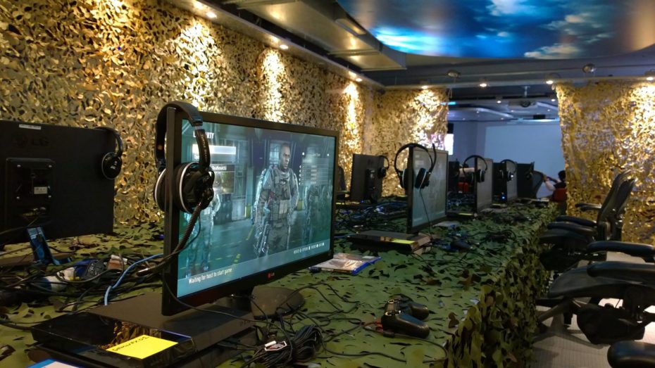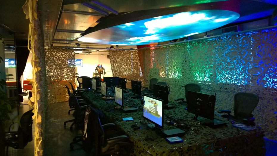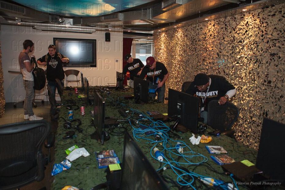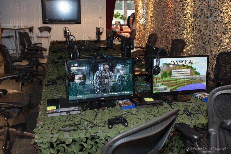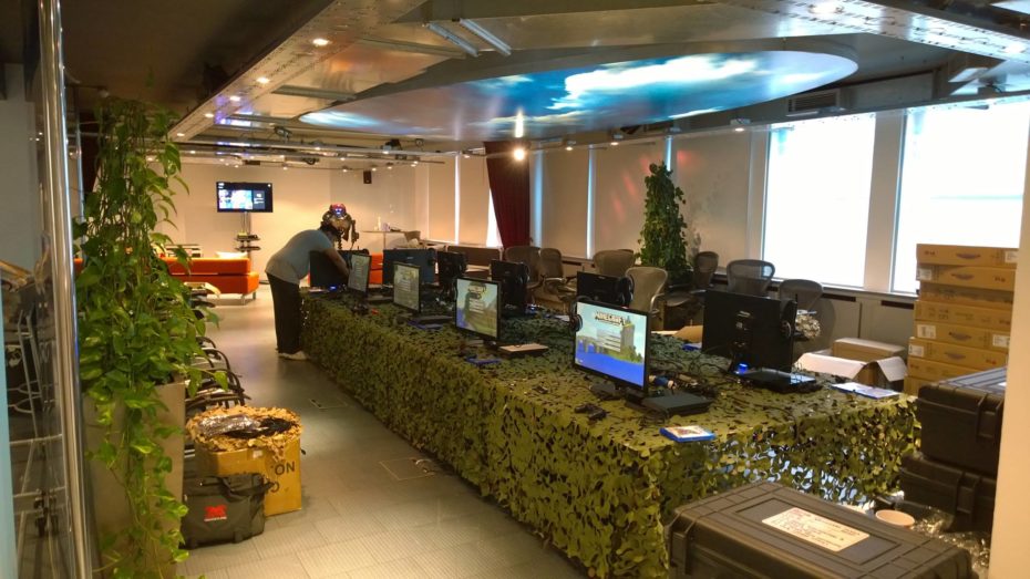 We set to work with a team of 3 during the build and 4 on the day to create the desired fun space and by using a variety of camouflage netting and multiple consoles and screens along with a quite a few wireless battery powered LED lighting units, turned the normal office meeting room into an ideal gaming zone for the competition winners to meet and play with Ali A with some team fun multiplayer action using Call of Duty Advanced Warfare and shared with some less frantic Minecraft.