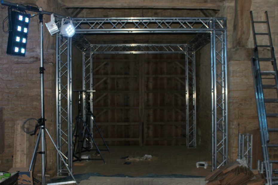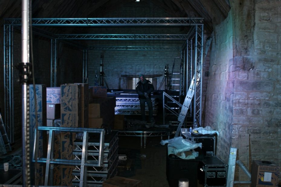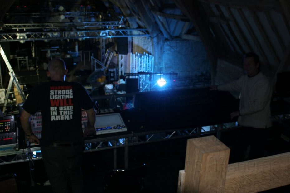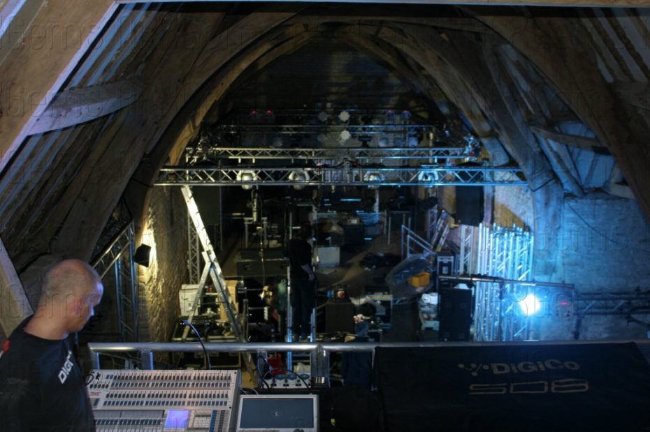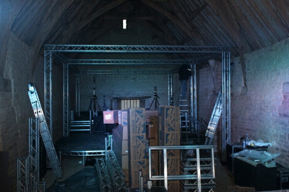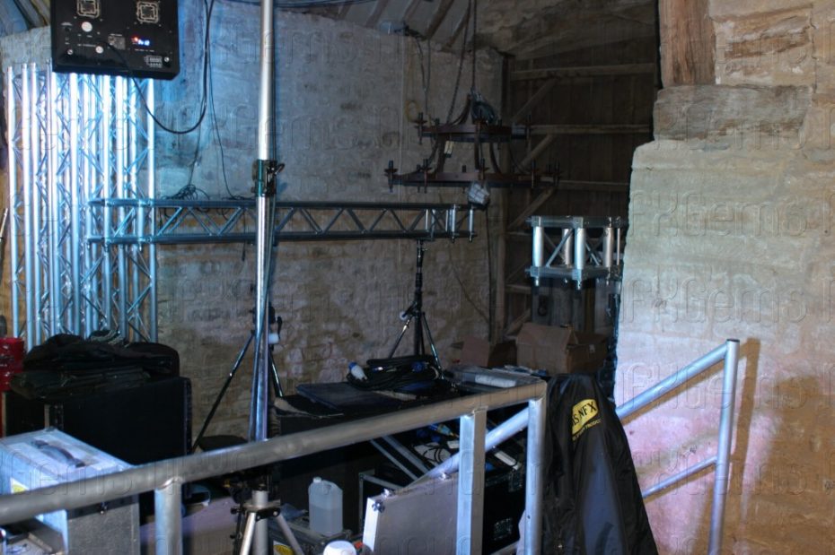 Special bespoke sections of stage and truss had to made and purchased to enable us to fit everything very tightly into the barn both at floor level and at rafter level and a whole week was used up just to make everything fit and be tested before other technical elements like the video cameras and lasers could be brought in for final testing.
