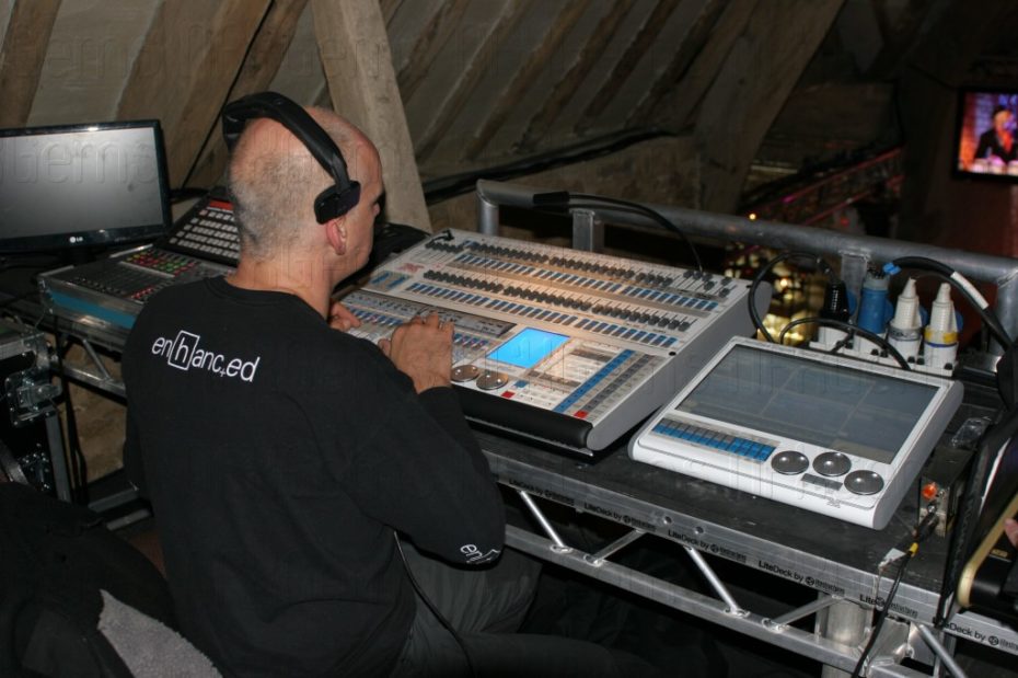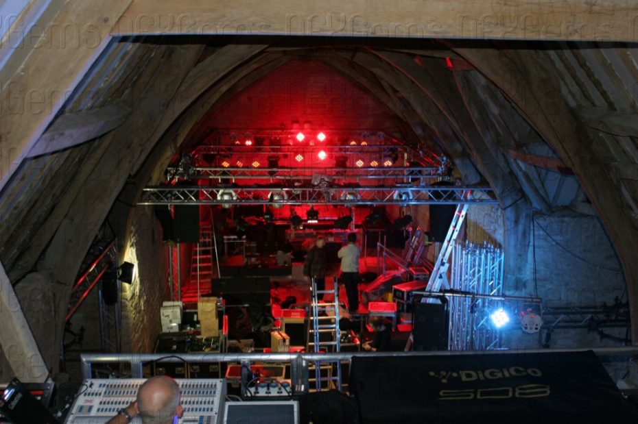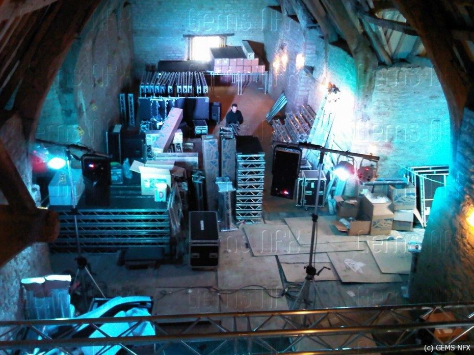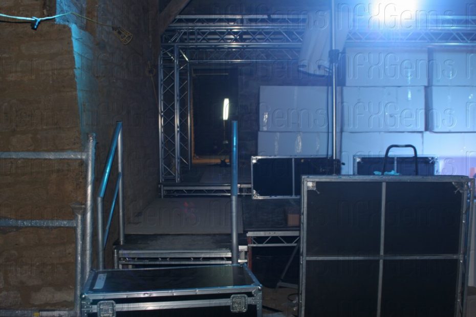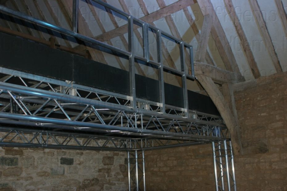 Special bespoke sections of stage and truss had to made and purchased to enable us to fit everything very tightly into the barn both at floor level and at rafter level and a whole week was used up just to make everything fit and be tested before other technical elements like the video cameras and lasers could be brought in for final testing.