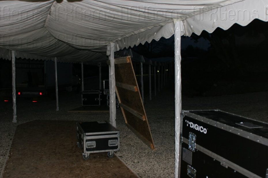 Power was going to be supplied by numerous generators as the split between the Barn and the landscaped gardens was quite a distance and quite a large PA system was installed by us to accompany the Laser and Firework show. The real challenge was accommodating 2 of the biggest bands on the live circuit with so much backline and band members in a limited space. The crossovers were going to have to be done like the changing of the guard with an external temporary structure added to the side of the barn to allow for all the additional instruments to be tuned and prepped.
